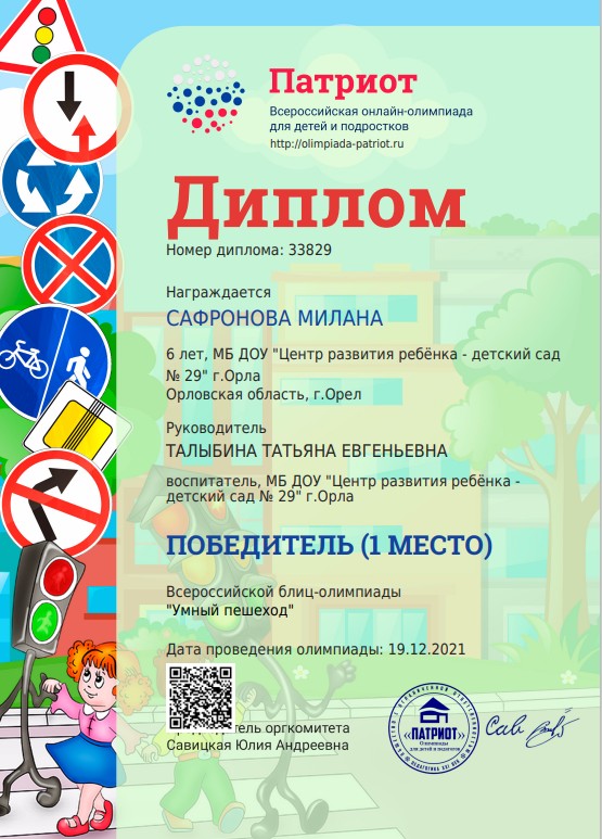 Всероссийская блиц-олимпиада "Умный пешеход" (Диплом 1 место, декабрь 2021г.)